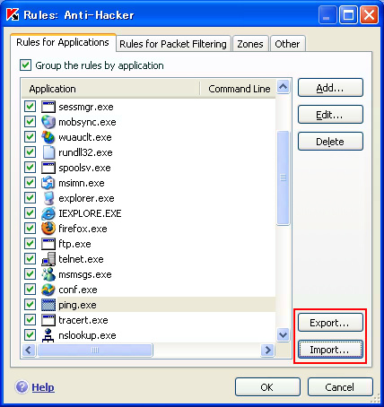 キャプ画像 : 「import」「export」ボタンでアプリケーション通信定義をiniファイルに書き出し、読み込み。