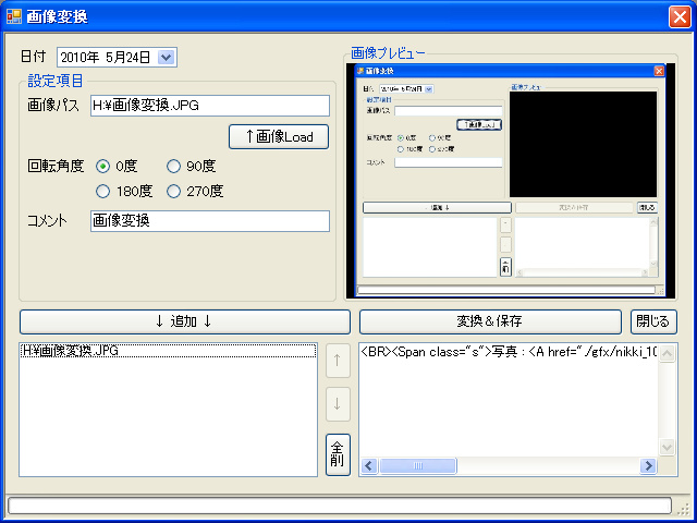 画像を指定すると、サムネイル画像と拡大画像とhtmlタグを吐き出してくれるたきつぼ日記でしか使えないようなソフト、まさに私利私欲アプリ。
