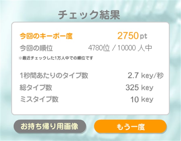 実践ではローマ字打ちや漢字変換などのロスがあるので、1分間に打てる文字数はたきつぼさんの場合、50〜60文字程度だと思います。