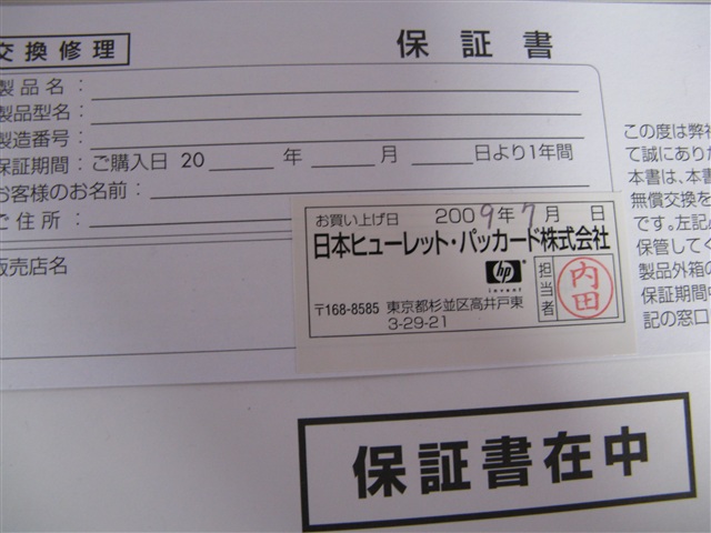 保証書を目を落とす、2009年7月、、、、日付書いてねー!